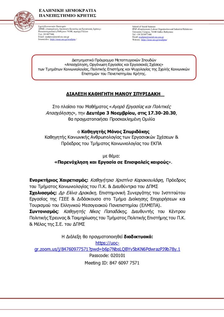 Στο πλαίσιο του Μαθήματος «Αγορά Εργασίας και Πολιτικές Απασχόλησης», την Δευτέρα 3 Νοεμβρίου, στις 17.30-20.30, θα πραγματοποιήσει Προσκεκλημένη Ομιλία ο Καθηγητής Μάνος Σπυριδάκης Καθηγητής Κοινωνικής Ανθρωπολογίας των Εργασιακών Σχέσεων & Πρόεδρος του Τμήματος Κοινωνιολογίας του ΕΚΠΑ με θέμα: «Παρενόχληση και Εργασία σε Επισφαλείς καιρούς».